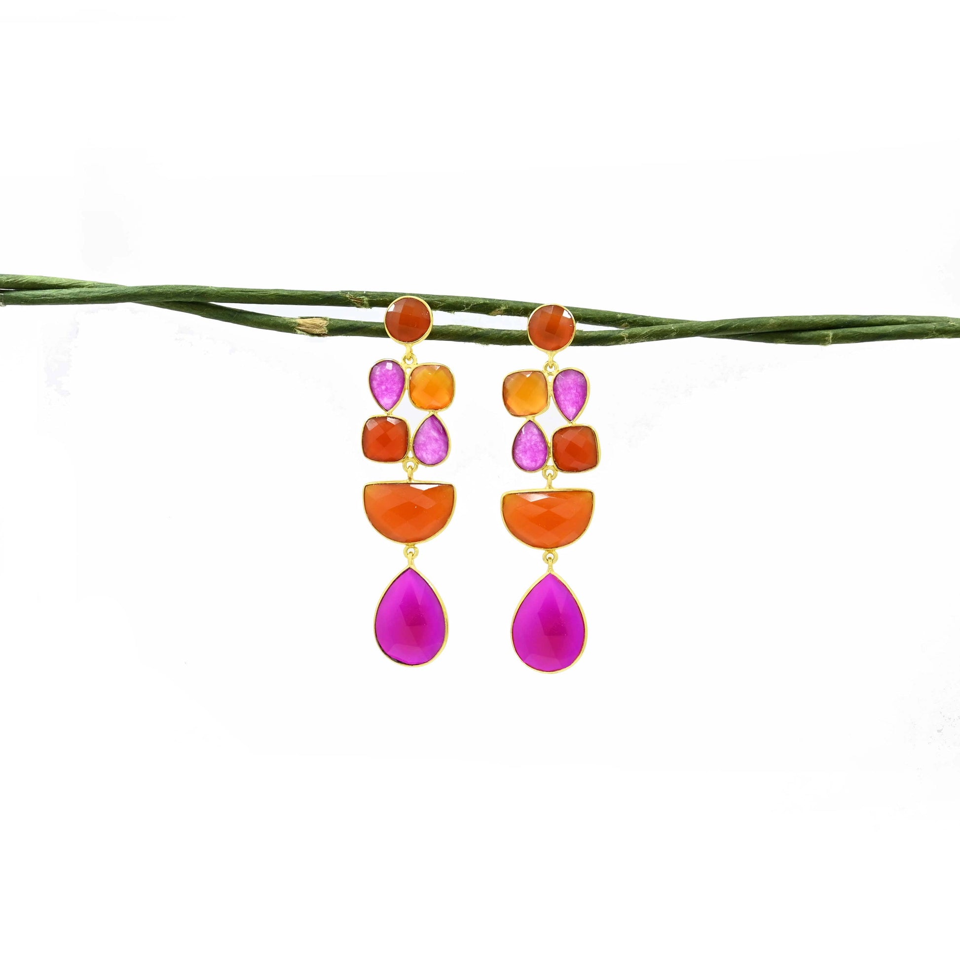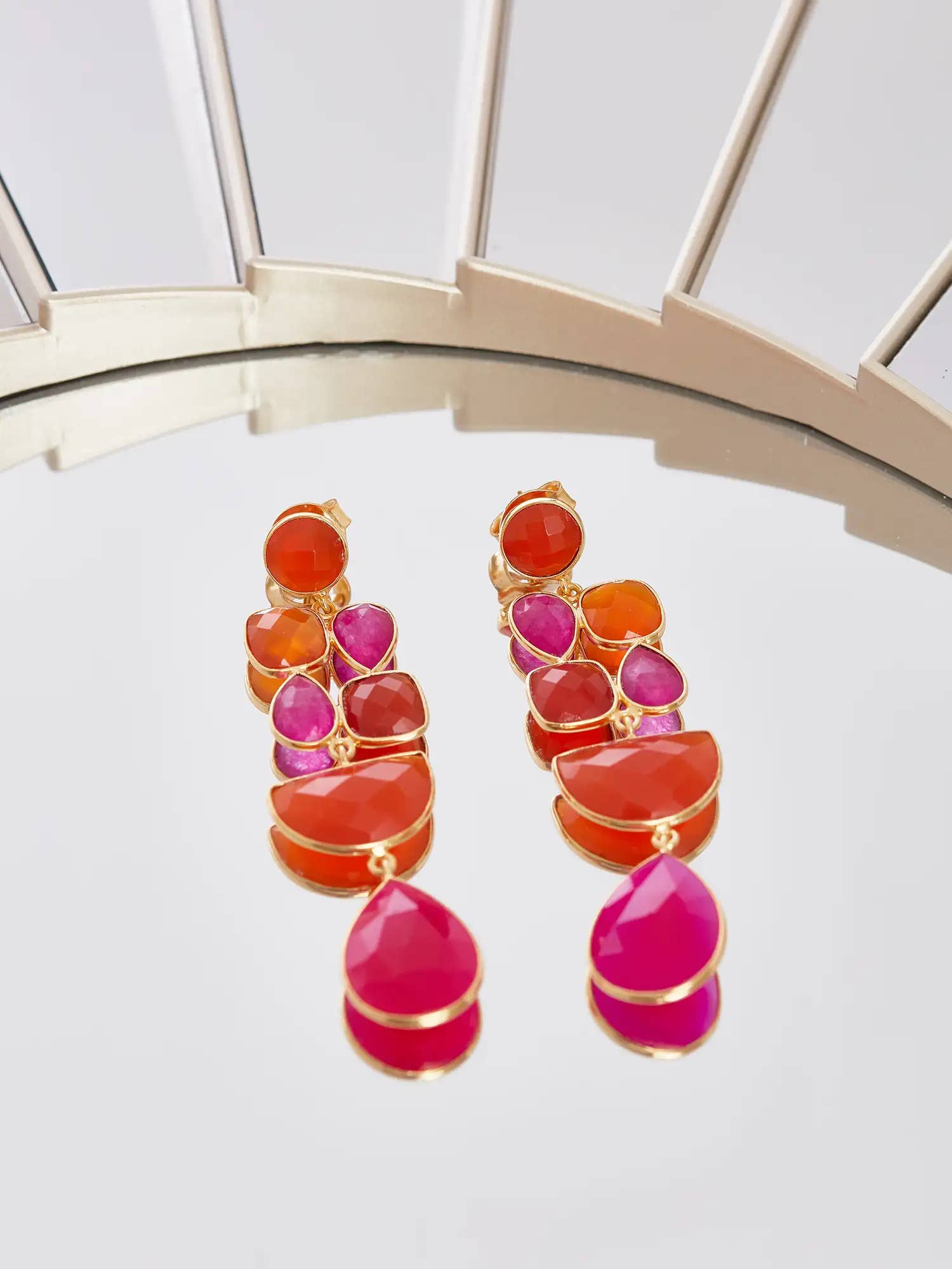 Boucle d'oreille Cocktail dorée - Onyx rose fuchsia et cornaline